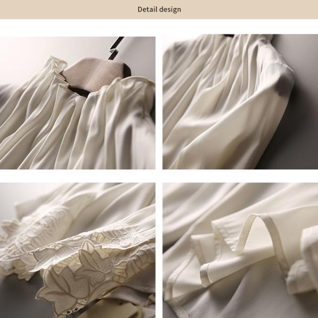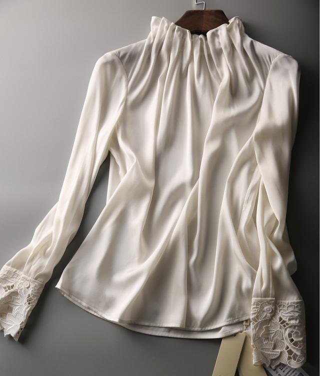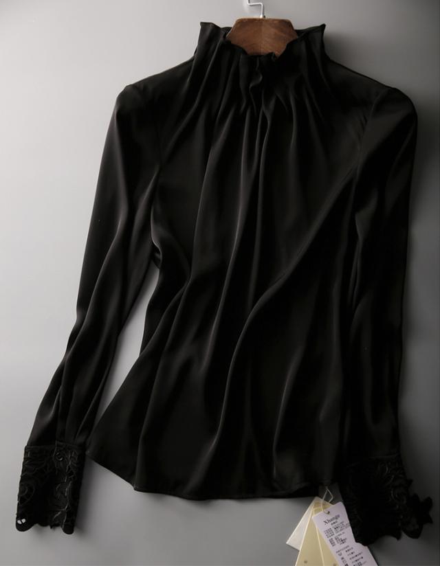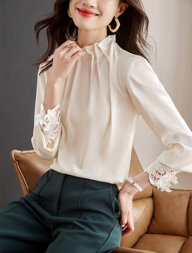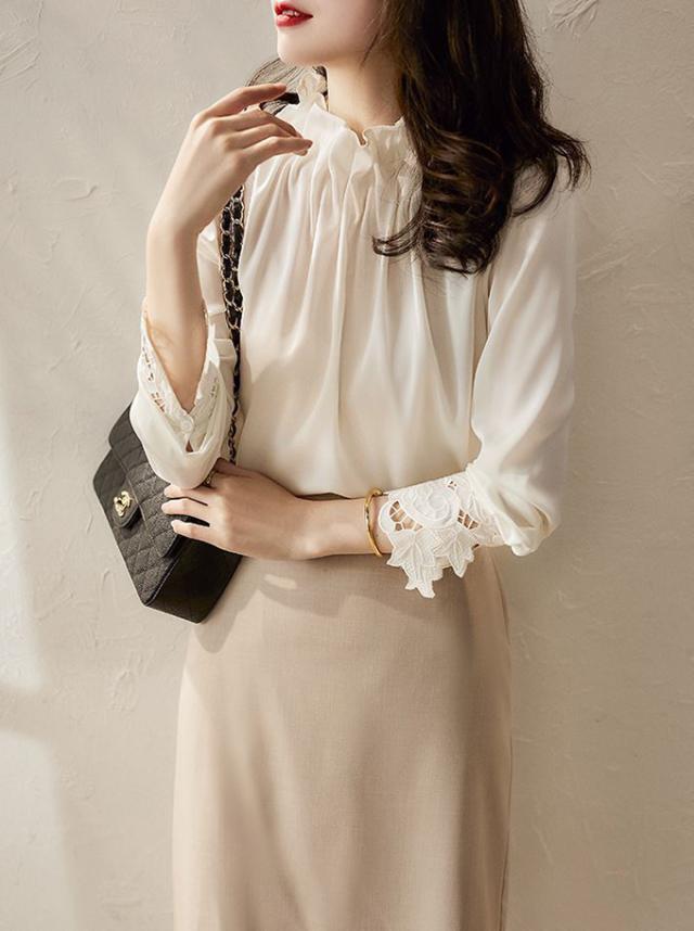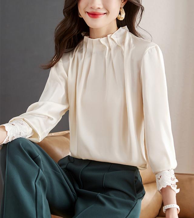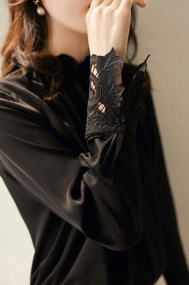 春新作 フリル襟 ブラウス レディース シャツ トップス 長袖 ハイネック レース袖 光沢感 フォーマル タック ギャザー キレイめ オフィス 春 夏 秋 大人可愛い