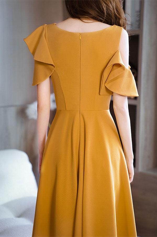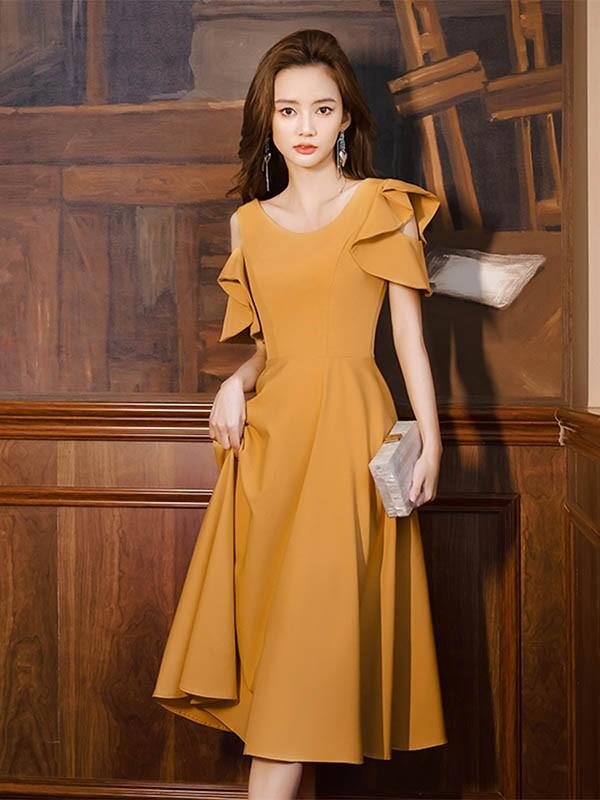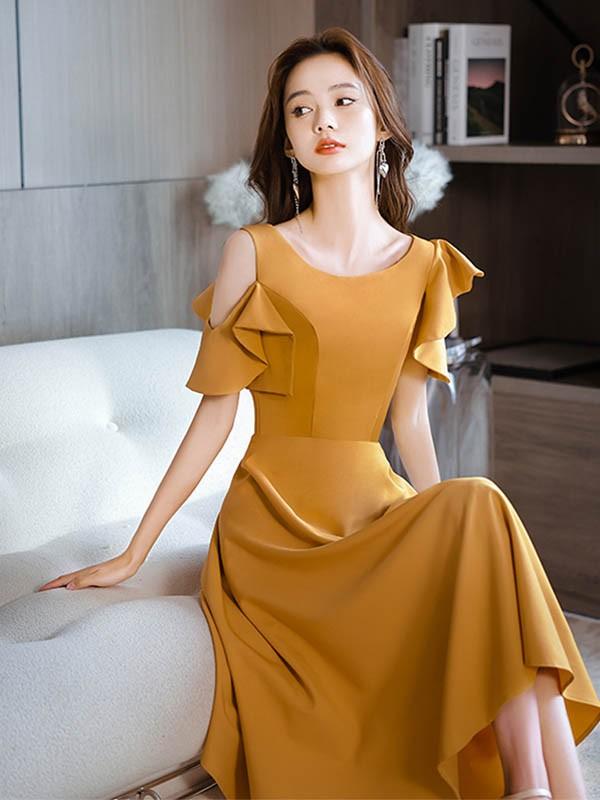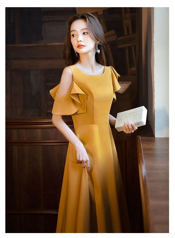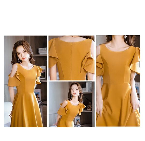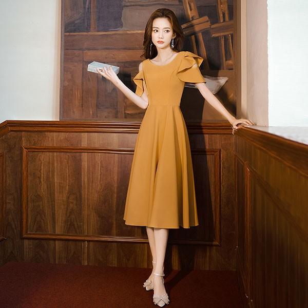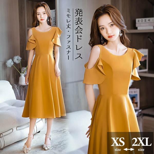 ミモレドレス ひざ下丈ドレス 演奏会 ピアノ 発表会 イエロー 黄色 ファスナー ラウンドネック 肩出し 袖あり 袖付き フェミニン カクテルドレス 大人 母親 結婚式 体型カバー 謝恩会 卒業式 誕生日会 ステージ 20代 30代 da229x1x1zr