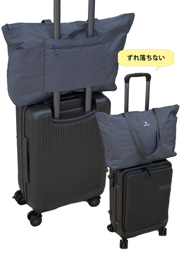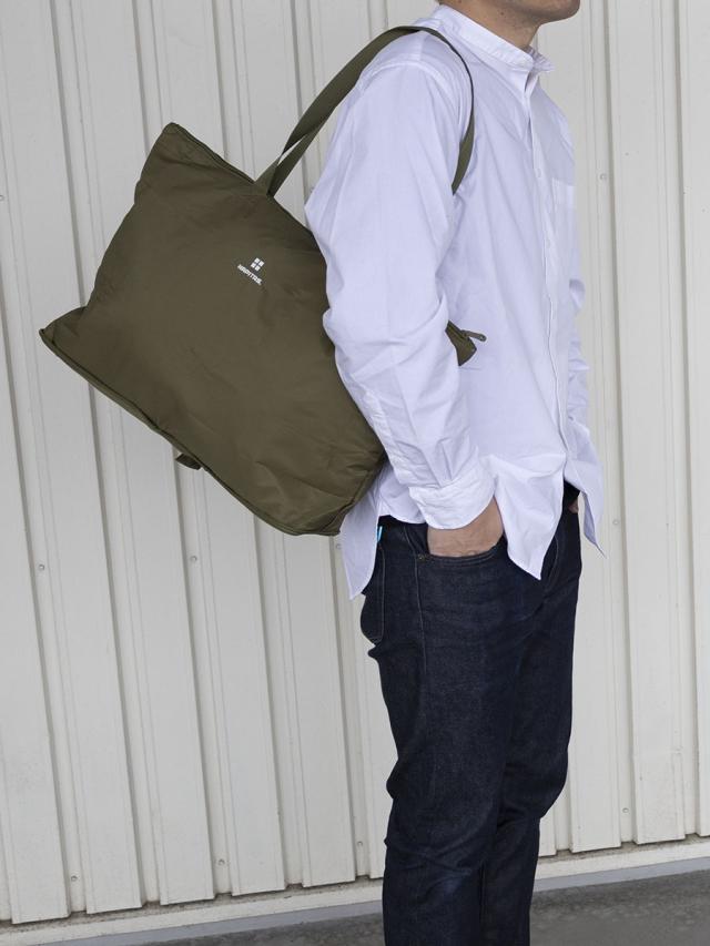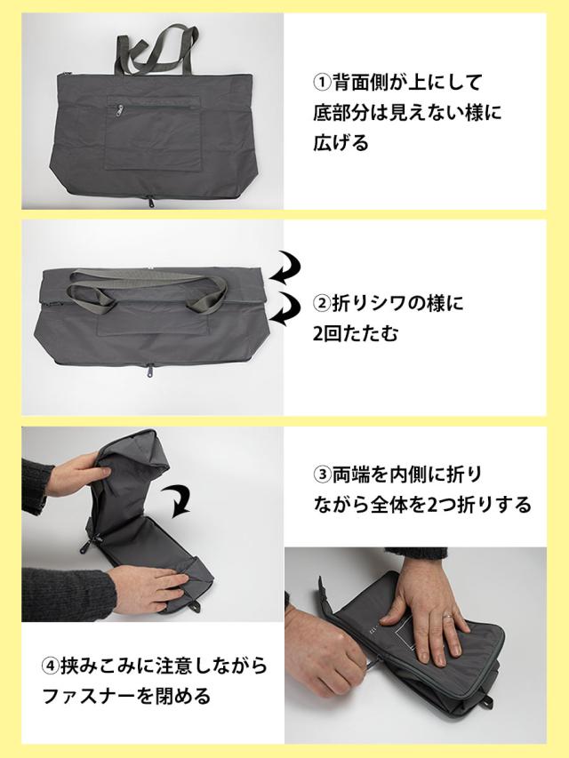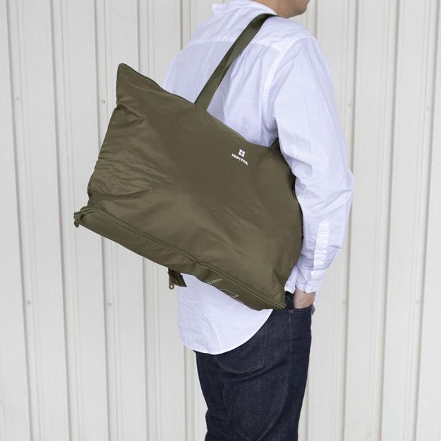 ■小さく持ち歩き必要な時に広げて使える約17Lの折りたたみトートバッグです。旅先で増えた荷物を入れたり、出先でなくなる荷物を入れて出かけ、たたんでバッグに入れて帰宅するなど、デイリーからトラベルまで1つ持っていると色々使えるアイテムです。
