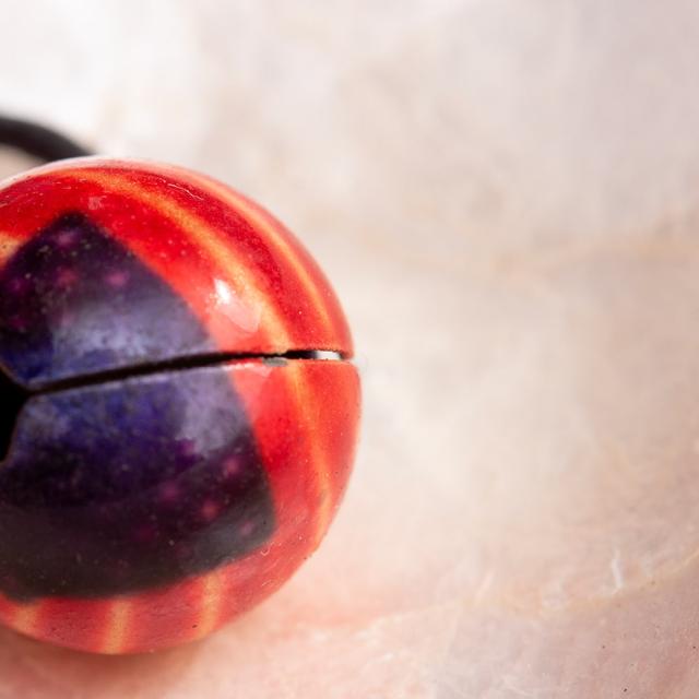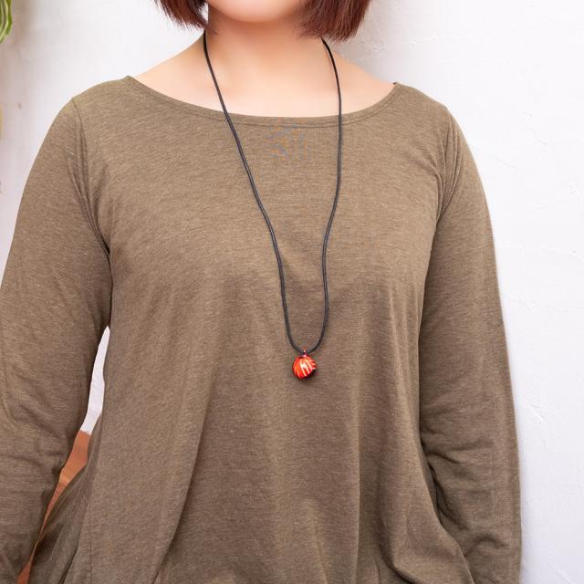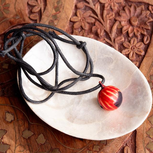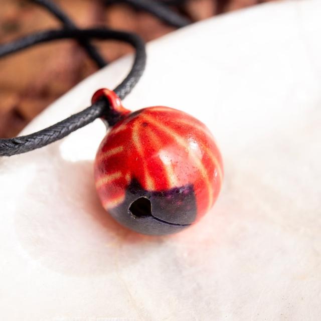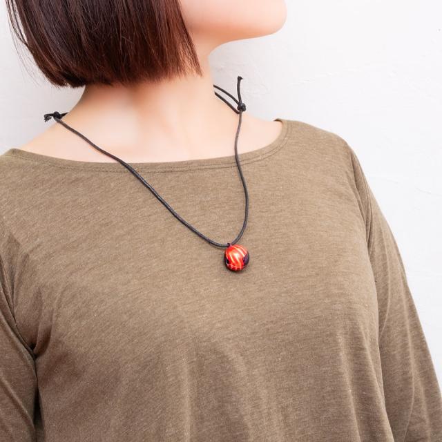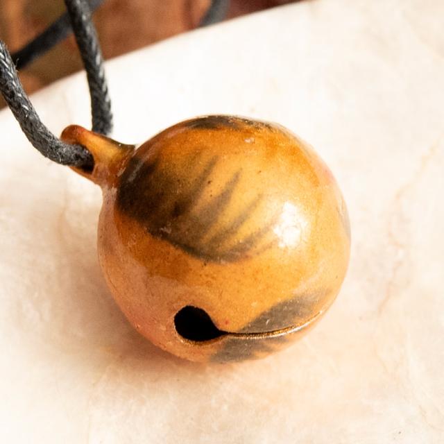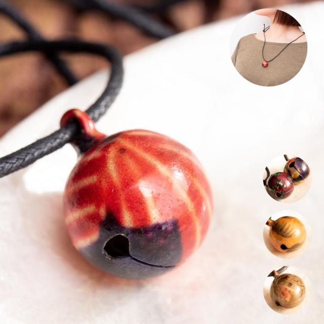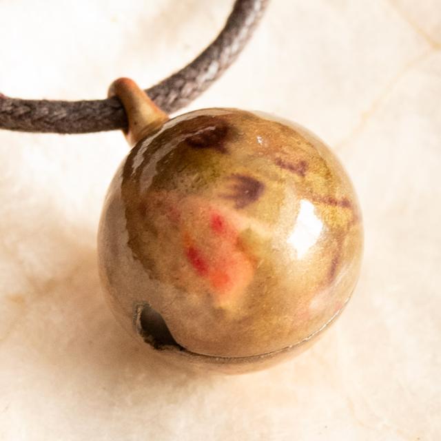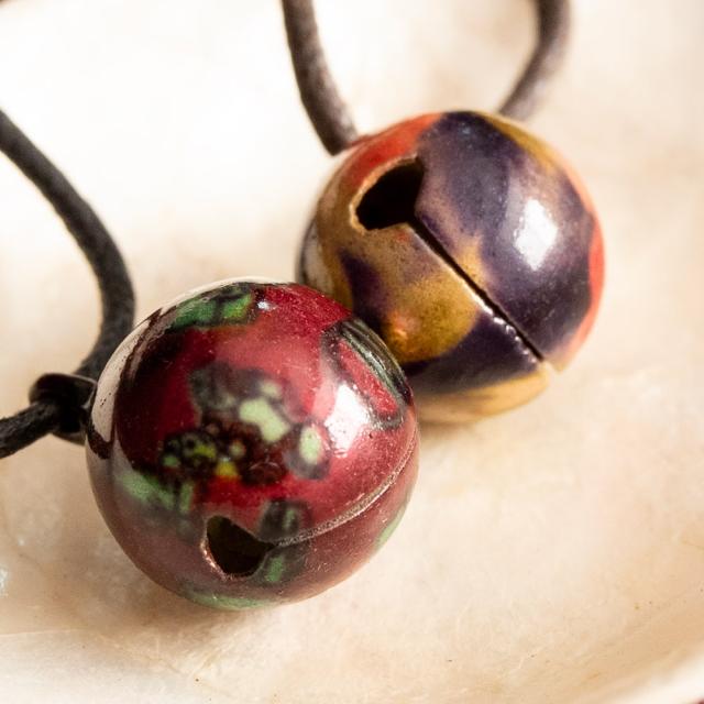 飴玉のような可愛い見た目と可憐な音の鈴のペンダントです。どこか和モダンを感じるような色合いと柄がすてき。付属のペンダント紐は長さが調節できるので、ペンダントにも、短くしてチョーカー状にもできます。