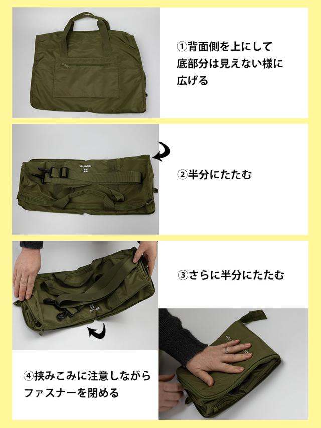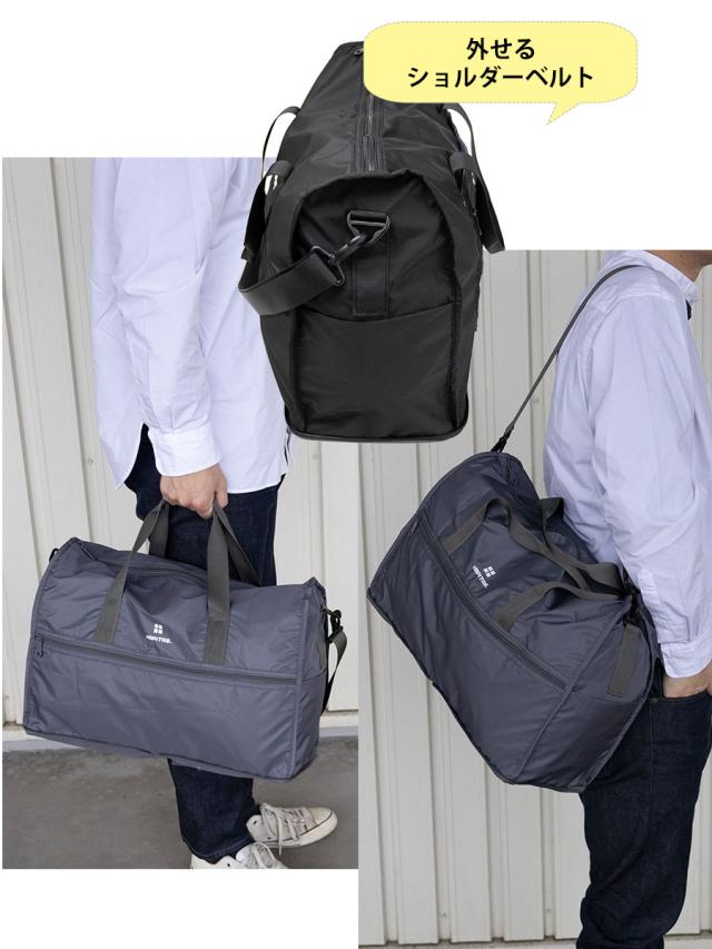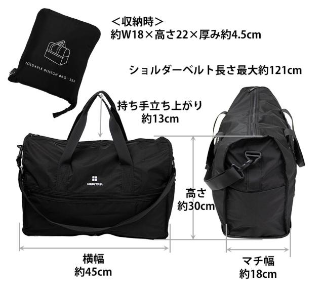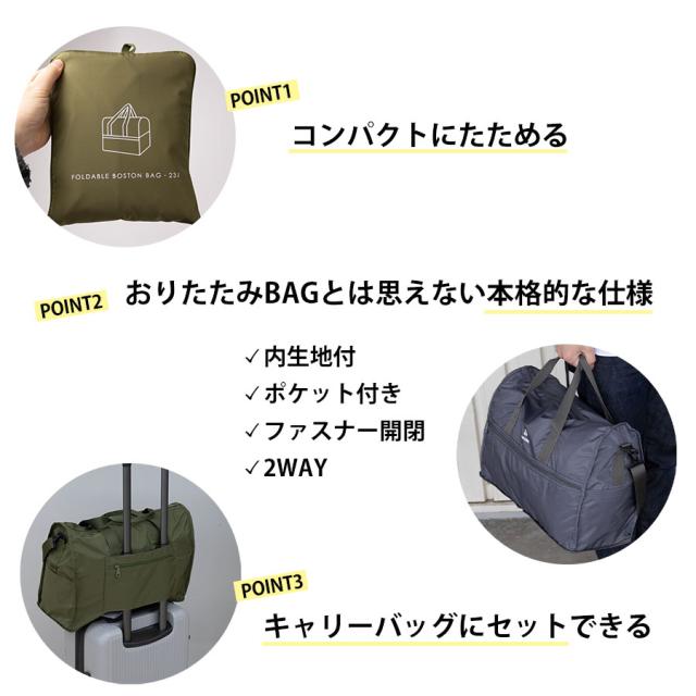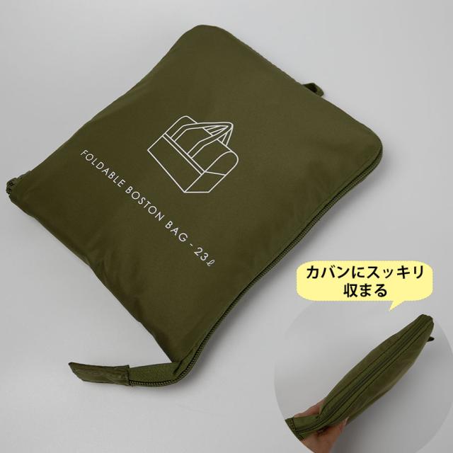 ■小さく持ち歩き必要な時に広げて使える約23Lの折りたたみボストンバッグです。ショルダーベルト付で荷物が多い時も楽々!旅先で増えた荷物を入れたり、出先でなくなる荷物を入れて出かけ、たたんでバッグに入れて帰宅するなど、デイリーからトラベルまで1つ持っていると色々使えるアイテムです。