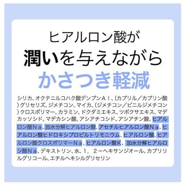 | 成分 | シリカ、オクテニルコハク酸デンプンAl、(カプリル/カプリン酸)グリセリズ、ジメチコン、マイカ、(ジメチコン/ビニルジメチコン)クロスポリマー、カラミン、ドクダミエキス、ツボクサエキス、マデカッソシド、マデカシン酸、アシアチコシド、アシアチン酸、ヒアルロン酸Na、加水分解ヒアルロン酸、アセチルヒアルロン酸Na、ヒアルロン酸ヒドロキシプロピルトリモニウム、ヒアルロン酸、ヒアルロン酸クロスポリマーNa、ヒアルロン酸K、加水分解ヒアルロン酸Na、デキストリン、水、1,2?ヘキサンジオール、カプリリルグリコール、エチルヘキシルグリセリン |
