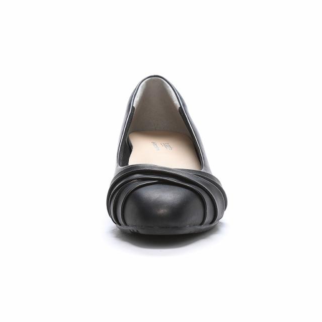 「ラクに歩けて、うつくしい」がコンセプトのパンプス「sugata」シリーズです。屈曲性の良いボロネーゼ製法を採用しています。インソールは足裏形状に合わせたアナトミー設計で荷重を足裏全体に分散し、衝撃吸収・荷重分散性能に優れた素材「マザータッチ」を使用しているため、ふんわり柔らかな履き心地となっています。アウトソールは中央部にくぼみを持つ独自開発の形状で、安定性に優れています。綺麗なフォルムでありつつ履き心地のよさも実現しました。お医者様からも姿勢のよい歩きをサポートする機能性が認められた商品です。ヒールは低めの3cmで、トレンド感を備えたソフトスクエアトゥにより、つま先の圧迫がより少ないのもうれしいところ。ツイストリボンがやさしくフェミニンな印象に仕上げます。シンプル過ぎないブラックカラーはさまざまなシーンでお使いいただけます。重量は23.0cmで片足約205gです。【履き口パッド】踵へのフィット感を高め、踵抜けしにくくなるような工夫を施しています。【静音リフト】歩行時のカツカツ音がなりにくいようトップリフトを硬度の違う二層構造にしました。【Ag+抗菌防臭】【耐摩耗ラバー】【軽量設計】