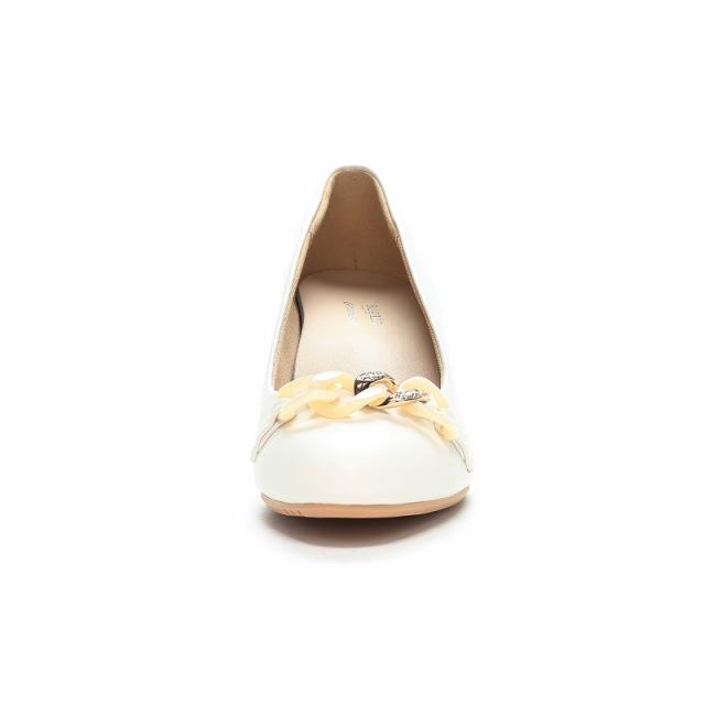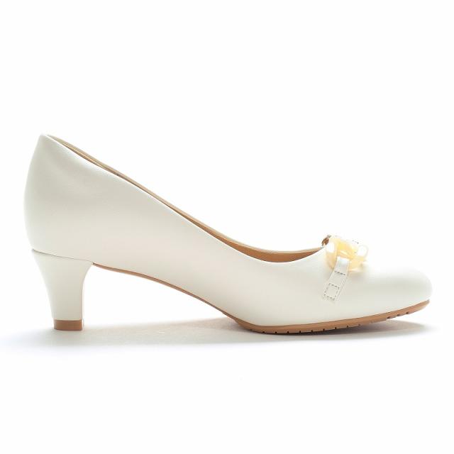 「ラクに歩けて、うつくしい」がコンセプトのパンプス「sugata」シリーズです。屈曲性の良いボロネーゼ製法を採用しています。インソールは足裏形状に合わせたアナトミー設計で荷重を足裏全体に分散し、衝撃吸収・荷重分散性能に優れた素材「マザータッチ」を使用しているため、ふんわり柔らかな履き心地となっています。アウトソールは中央部にくぼみを持つ独自開発の形状で、安定性に優れています。綺麗なフォルムでありつつ履き心地のよさも実現しました。お医者様からも姿勢のよい歩きをサポートする機能性が認められた商品です。人気のワイドウィズ設計です。透け感のあるミルキーなアクリル&キラリと光るビジュー付きのメタルチェーンを使ったホワイトカラーは爽やかな中にも、知的なムードが香ります。ヒールの高さは5cm、重量は23.0cmで片足約210gです。【履き口パッド】踵へのフィット感を高め、踵抜けしにくくなるような工夫を施しています。【静音リフト】歩行時のカツカツ音がなりにくいようトップリフトを硬度の違う二層構造にしました。【Ag+抗菌防臭】【耐摩耗ラバー】【軽量設計】