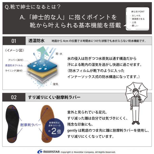 「紳士になれる靴」をコンセプトに革靴のもつ雰囲気や上品さをカジュアルシューズに落とし込んだシューズライン「gently」。30年以上の歴史がある日本初のウォーキングシューズブランドWORLD MARCHの技術力を引き継ぎ、履く人にも“優しい”履き心地を実現。素材は本革で、紳士になれる機能を随所に搭載しています。デザインは内羽根のコートスニーカータイプ、重量は片足約440g/25.5cmです。【防水設計(4cm×8時間)】地面から4cm、8時間の浸漬状態での防水性を備えた防水機能です。強い雨などでのご使用の場合は上部から水が浸入する場合もあります。【透湿防水】雨などによる外部からの水の浸入を防ぎつつ、汗による湿気を外部に逃がします。【耐摩耗ラバー】靴底に耐摩耗ラバーを使用し、踵がすり減りにくく、いつも上品な後ろ姿に。耐摩耗性は通常ラバーの約2倍。【撥水レザー】濡れても水を弾き、水滴をさっと拭ける本革だからお手入れ簡単。本革は手入れが面倒、という悩みを解決します。【Ag+抗菌防臭】銀イオンの抗菌作用で臭いのもととなる菌の増殖を抑制し、防臭効果を発揮します。天然由来成分で安全です。