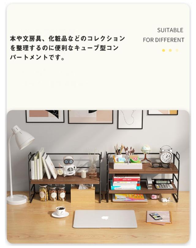 | 卓上収納 デスク上収納ラック。オープンラック。 【高品質素材】厚みのある天然木化粧繊維板を使用します。良好な安定性を確保します。 【可動式棚板簡単高さ調節】 可動式棚板のオープンシェルフは、高いものも簡単に収納することができます。 安全の丸い角! 【高収納力】収納やディスプレイのための仕分けスペースが充実しています。 【幅広い用途】本や文房具、化粧品などのコレクションを整理するのに便利なキューブ型コンパートメントです。 オープンシェルフは、使用頻度の高いものを簡単に収納することができます。 【使用方法】1.ボタンを板の穴に押し込む。2.棚板をフレームを掛ける。 | |