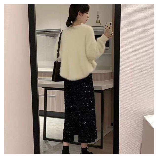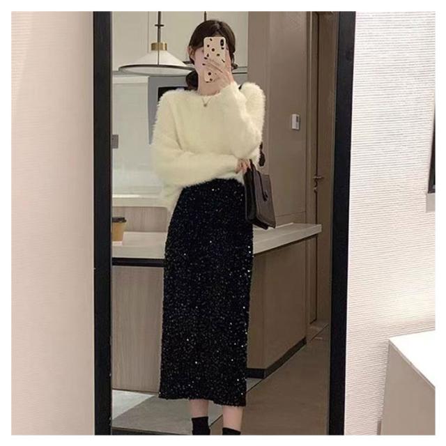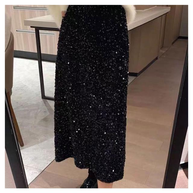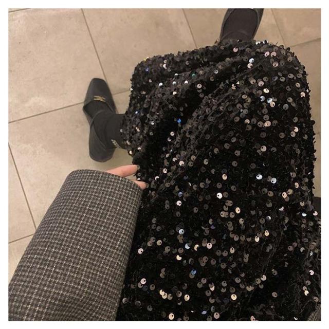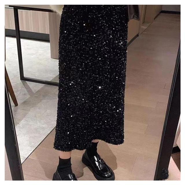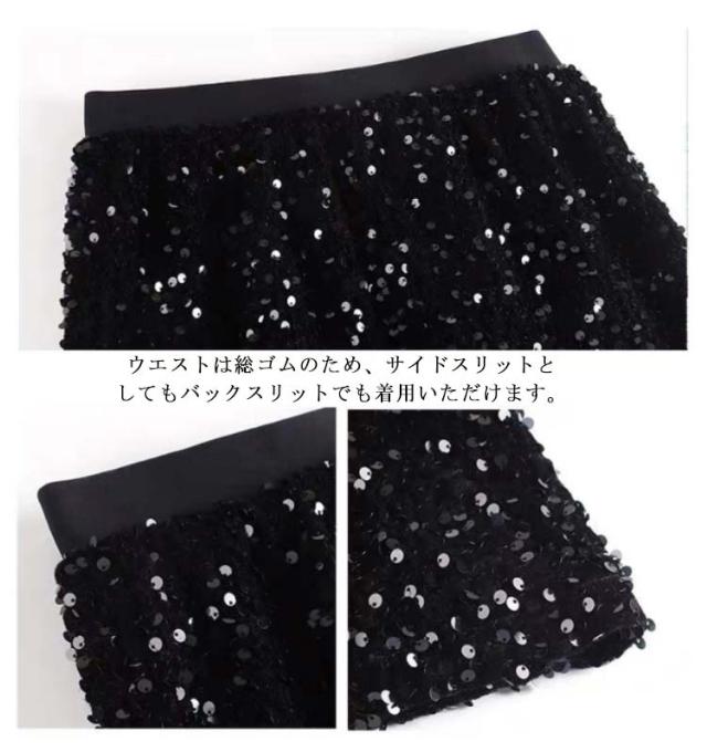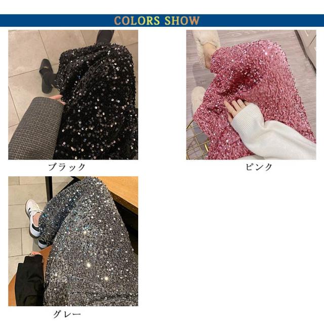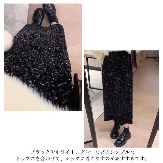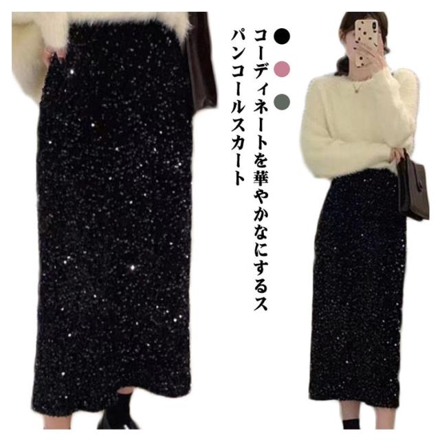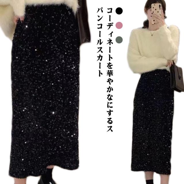 ハイウエスト スカート 美脚 ロングスカート スパンコールスカート スカート 体型カバー ボトムス ナロースカート 上品 タイトスカート ロング丈 ウエストゴム 光沢 大人 カジュアル 秋 冬 結婚式 パーティー