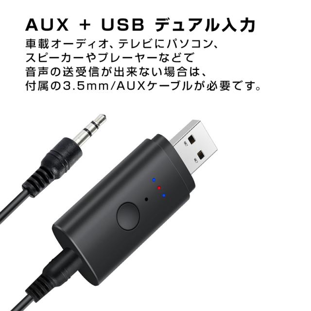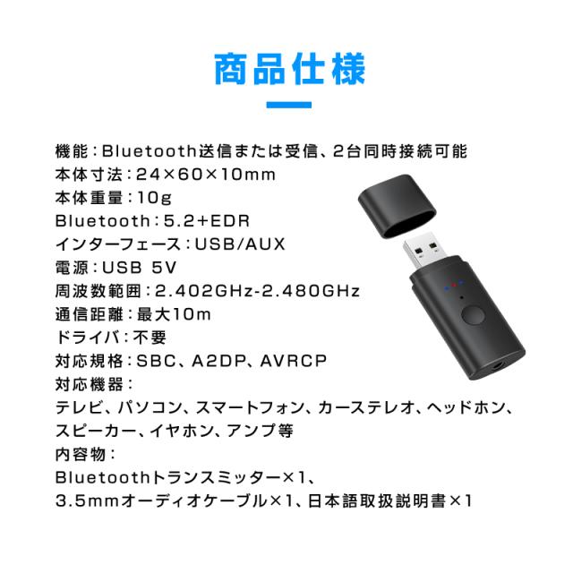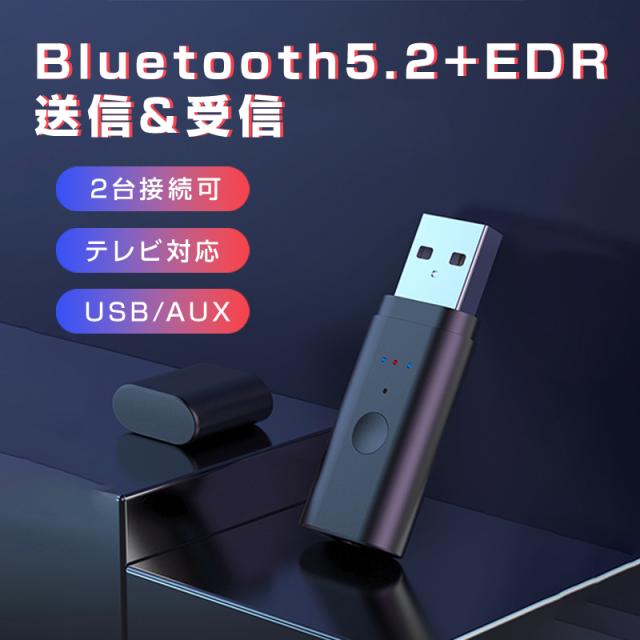 トランスミッター レシーバー Bluetooth5.2 USB 2台同時接続可能 送信 受信 オーディオ アダプタ 自動接続 ワイヤレス 車 テレビ ヘッドホン イヤホン スマホ PC