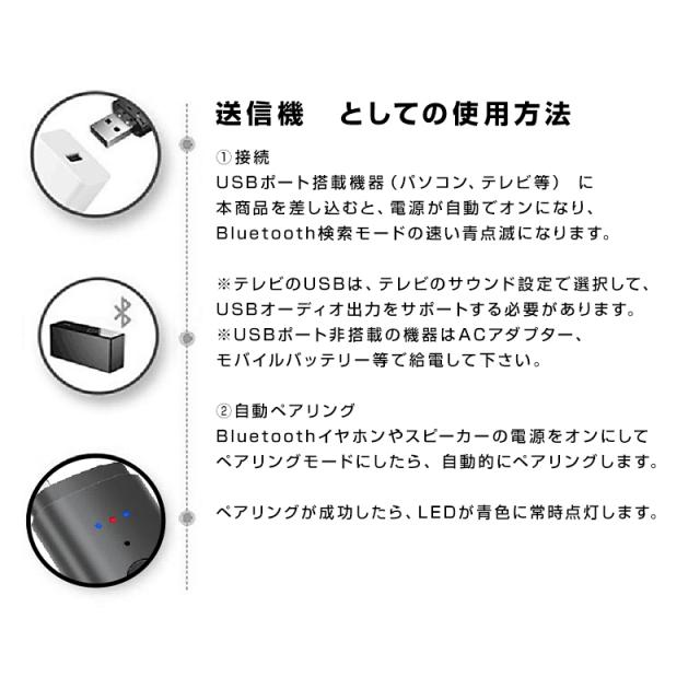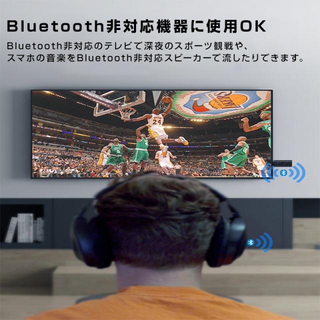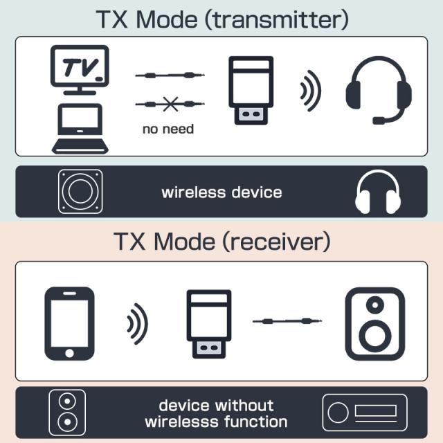 送信モード(トランスミッター):テレビやパソコンなどのBluetooth非対応機器に本製品を差し込み、Bluetoothイヤホンやヘッドホンで再生します。