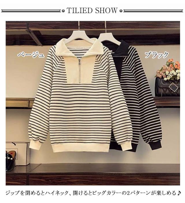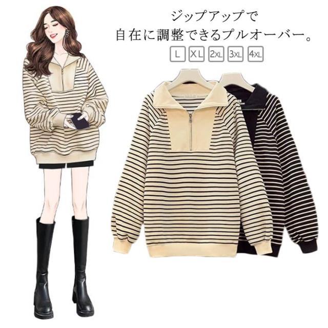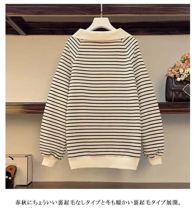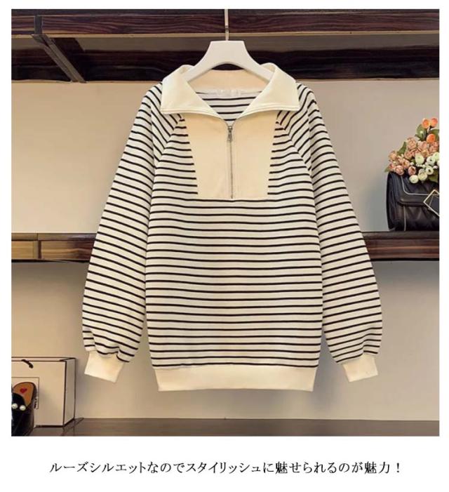 スウェット スウェット トレーナー ハーフジップ トップス 裏起毛 薄手 大きいサイズ プルオーバー ゆったり ビッグカラー ボーダー レディース パーカー 春 秋 冬 ハーフジップ トレーナー スウェット