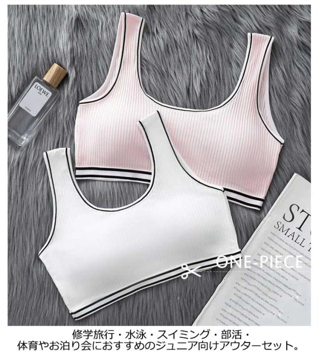 | 小学生高学年〜中学生向け女の子用下着。 スポーツブラとパンツの上下セットアップです。 綿素材で気持ちいい肌触り。 修学旅行・水泳・スイミング・部活・体育やお泊り会におすすめのジュニア向けアウターセット。 伸縮性のあるノンストレスな着心地。 ファーストブラにおすすめ、パット入りなので安心。 新学期や新年に向けて新しい下着セットは色違いでも欲しくなっちゃう! | |