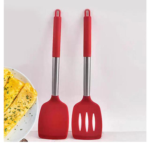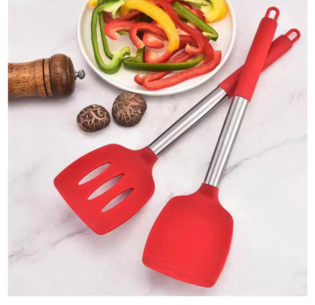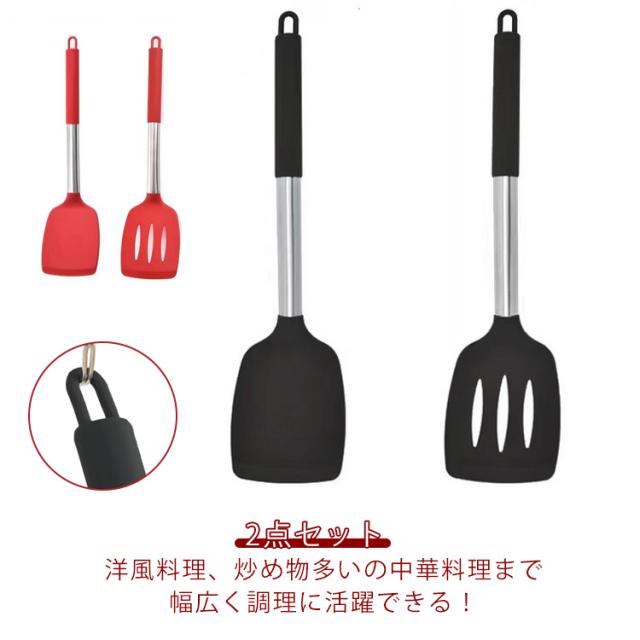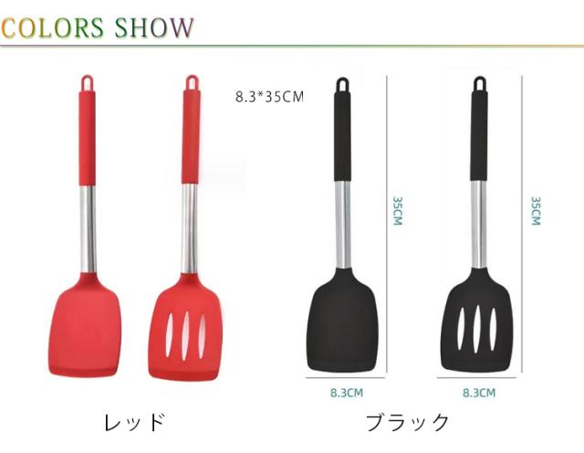| 洋風料理、炒め物多いの中華料理まで幅広く調理に活躍できる! 高品質の食品用シリコンを使用しているため、実物に直接触れても安全で、無毒無臭なので安心です。 250度の高温でもOK!フライパンを傷つけにくいシリコン素材。 使いやすいハンドル、熱くならず、グリップ感も抜群です。 持ち手の穴で吊り上げられて、全てを重ねて収納もできます。 | |