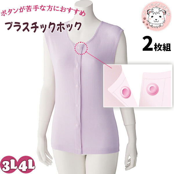 ラン型 ホックシャツ 2枚組 綿100% 抗菌 防臭 名前記入欄付 3L/4L 婦人用 肌着 タンクトップ ノースリーブ 前開きシャツ プラスチックホック式 介護インナー