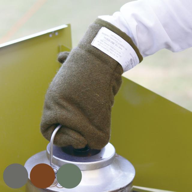 ミリタリーライクなブランケット生地を使ったキッチンミトンです。ケトルやフライパンなどアウトドアでの調理に、薪運びの保護グローブに、調理中の鍋敷きに、様々なライフシーンで活躍します。メンズライクなデザインと落ち着いた色合いは男女問わず使いやすくなっています。またインテリアとして吊下げて見せる収納にするのもおすすめです。