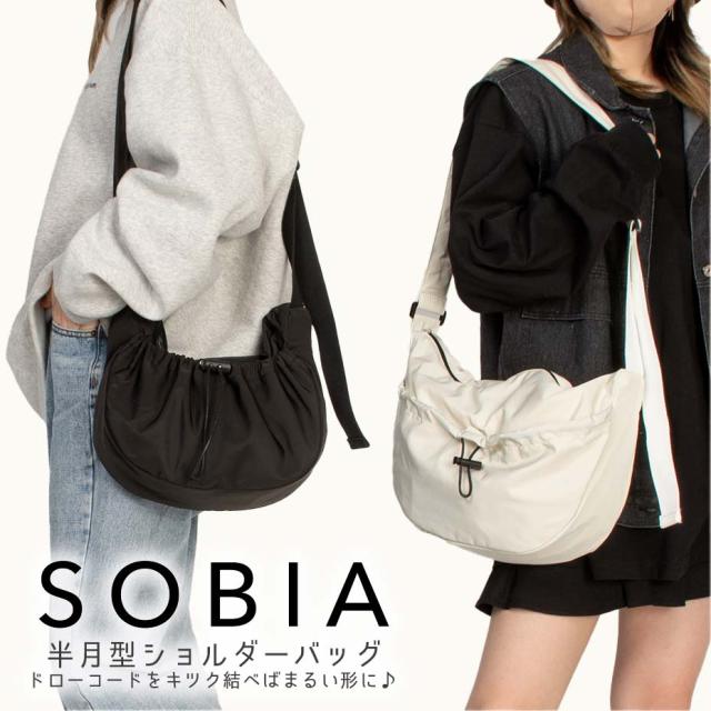 SOBIA 半月型ショルダーバッグ レディース 軽量 ポケット 太め ドロストデザイン 肩掛け ショルダー 安定感 シンプル 旅行 レジャー 鞄 バッグ ブラック 黒 白 ボディバッグ メッセンジャーバッグ ソビア ポルカポルカ ブランド
