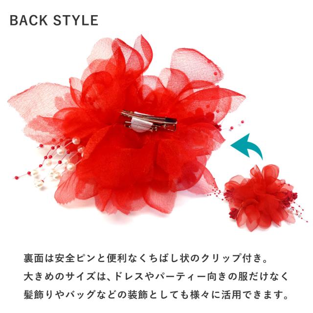 約15cmと大きく存在感があるお花は、ドレスやパーティー向きの服装だけでなく