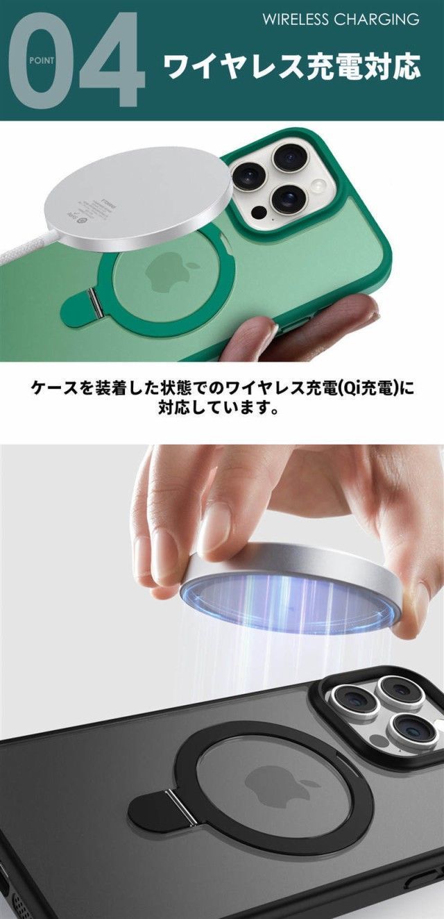 ケースを装着した状態でのワイヤレス充電(Qi充電)に対応しています。