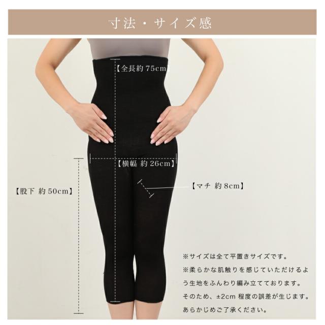 ・フリーサイズ(腹囲55-100cmぐらいまでの方対応) ・総丈:約75cm ・股上:約25cm ・股下:約50cm ・横幅:約26cm ※すべて平置きサイズです。 (柔らかな肌触りを感じて頂けるよう生地をふんわりと編み立てております。その為±2cm程度の誤差が生じます。予めご了承下さい。) |