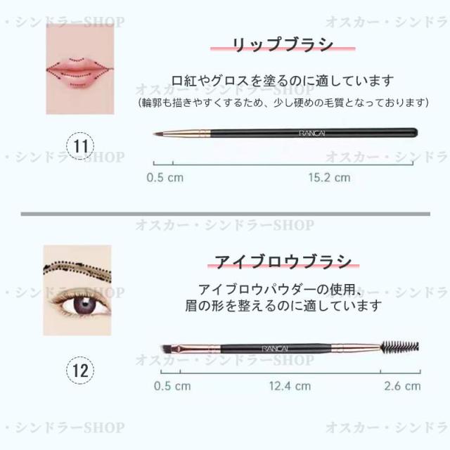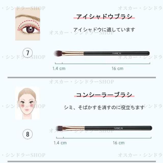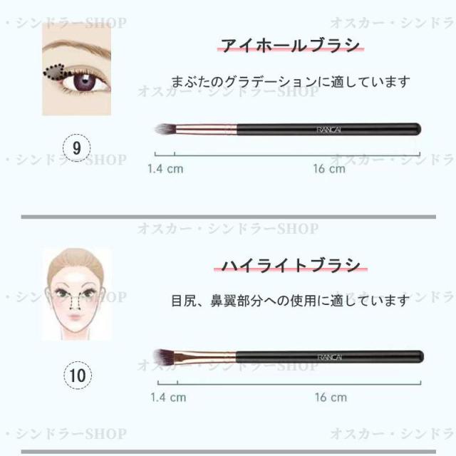 ファンデーションブラシとフェイスブラシのセットで、素早くナチュラルなベースメイクを完成させることができます。また、チークブラシ、シェーディングブラシ、ノーズシャドウブラシ、ハイライトブラシが含まれており、お顔を立体的で自然な仕上がりに演出します。さらに、3種類のアイシャドウブラシとアイブロウブラシも付属しており、あなたの目元をより魅力的に輝かせてくれます。