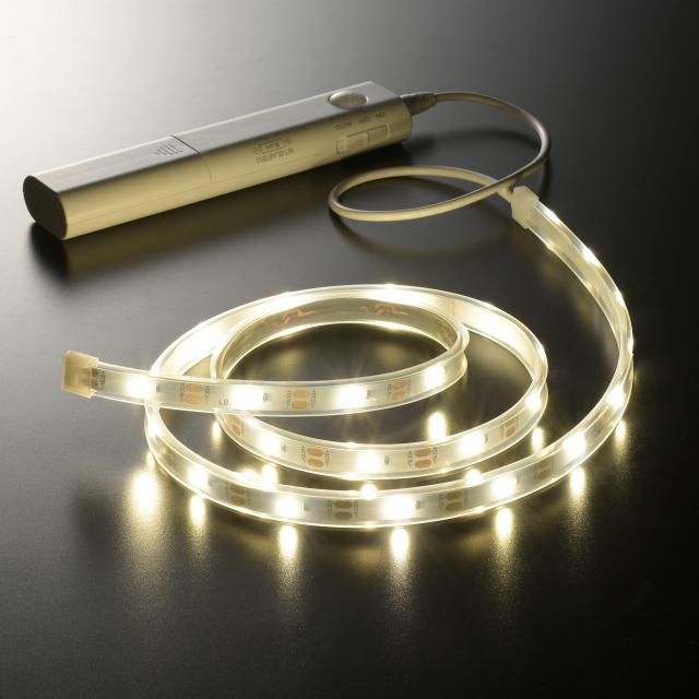 【 特 長 】 ◆お好みの長さにカットしてご使用できます。 ◆付属の両面テープまたはマグネットテープで設置します。 ◆暗い場所で人の動きを検知して自動で点灯します。 ◆乾電池式で電源の取れない場所でも使用できます。 ◆ON(常時点灯)/OFF(消灯)/AUTO(センサー)切換スイッチ付き ◆テープライト長さ1m ◆点灯色は白色