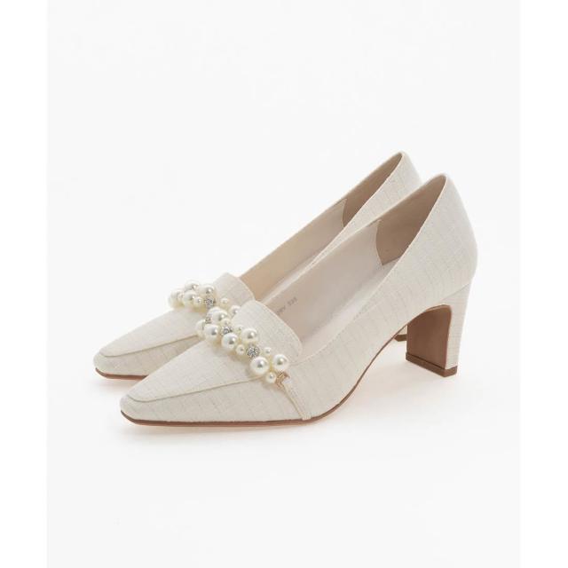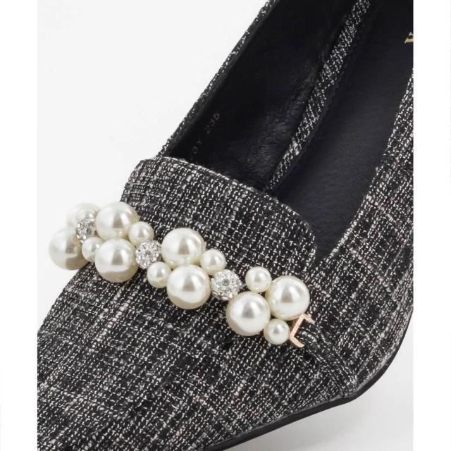 マニッシュな印象のローファーシューズにパールパーツを施し、