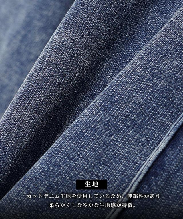 綿とポリエステルの使用により、見た目はデニムなのに、さらりと軽やかな生地感に仕上げた一着。
