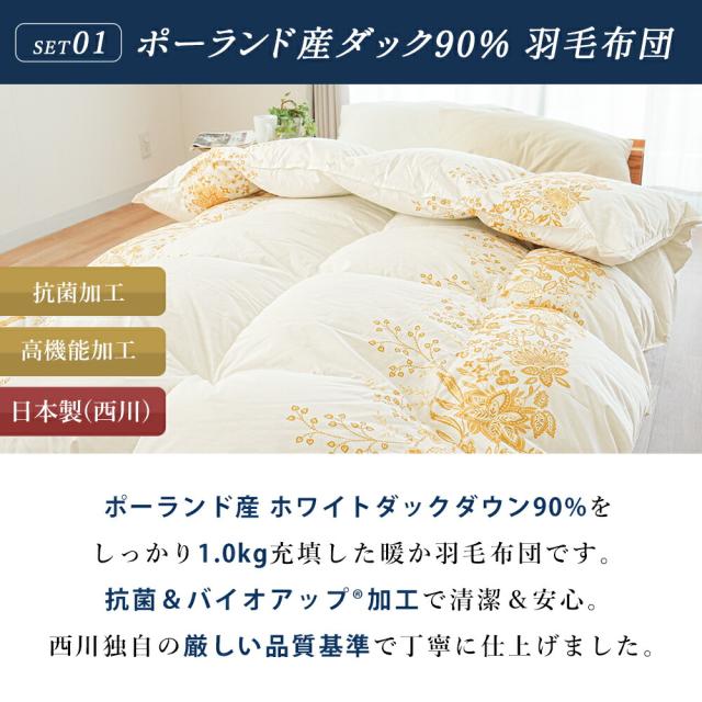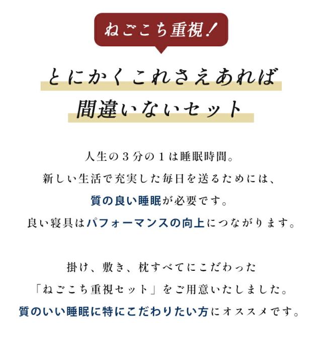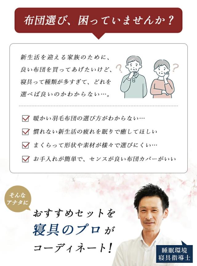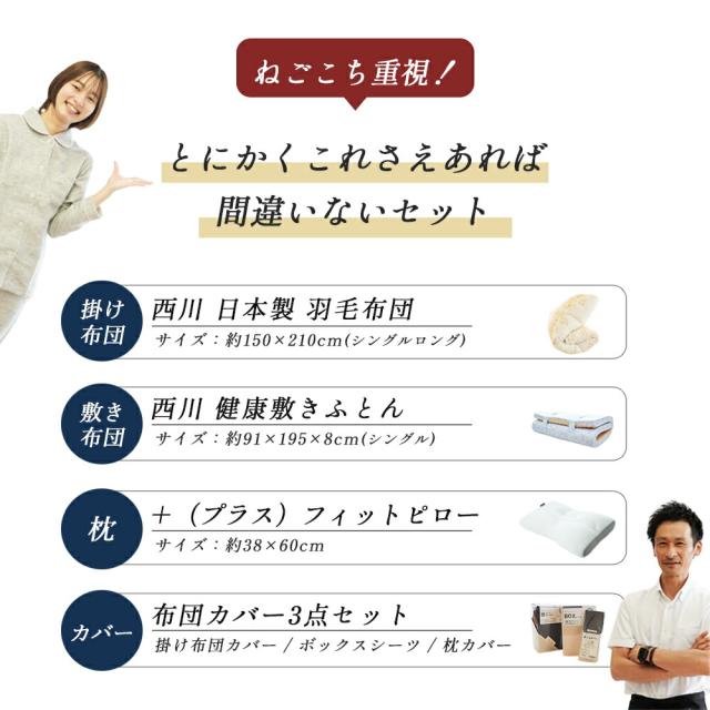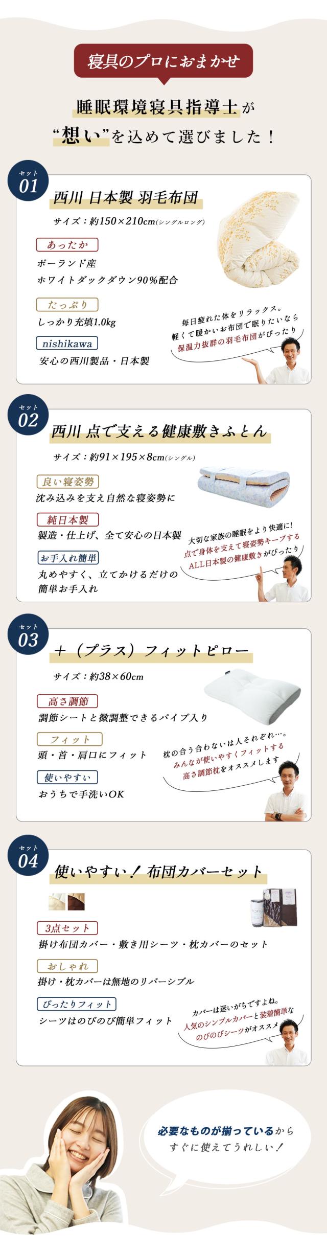 | ・ねごこち重視!とにかくこれさえあれば間違いないセット 良い寝具を使うことで翌日のパフォーマンスが変わります。掛け・敷き・枕すべてにこだわった、ねごこち重視のセットです。 ・創業50周年以上の老舗ふとん屋が選んでいます。長年営業してきた当社が厳選。睡眠環境寝具指導士など眠りのプロが在籍し、良質な寝具をお選びいただけます。 ・西川の高品質羽毛布団ポーランド産ホワイトダックダウン90%を1.0kg充填。抗菌&バイオアップ(R)加工で清潔。西川独自の品質基準で仕上げています。 ・点で支えて寝姿勢をきれいに!健康敷き布団「点」で支える構造で寝姿勢をキープ。寝返りしやすく、お手入れも簡単。ウレタンフォームから縫製まで日本製。 ・プラスフィットピローシートとパイプで細かく高さ調節が可能。首と肩口にフィットするアーチ形状です。 ・リバーシブル布団カバー3点セット人気の「FROM」掛け・枕カバーと、装着簡単な西川「Nov-iQ(ノビック)」シーツのセット。使いやすく高品質なカバーです。 | |