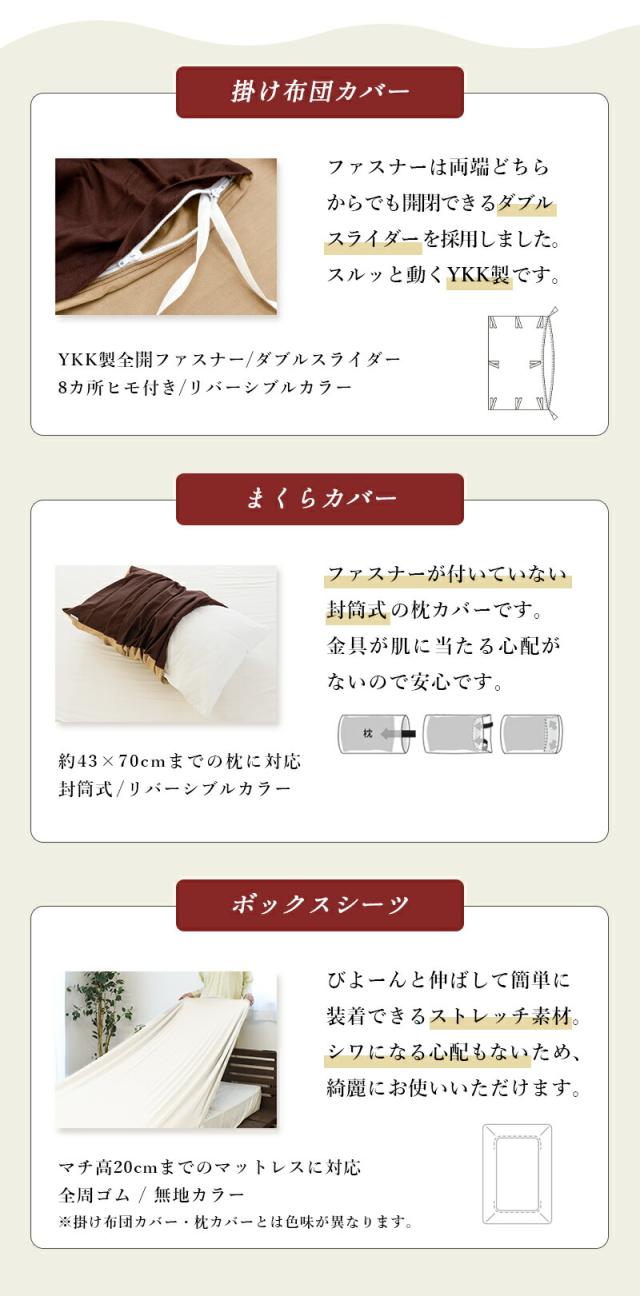| 仕様 | 掛けカバー:YKK全開ファスナー / 8ヶ所ヒモ付き / ダブルスライダー / リバーシブルカラー |