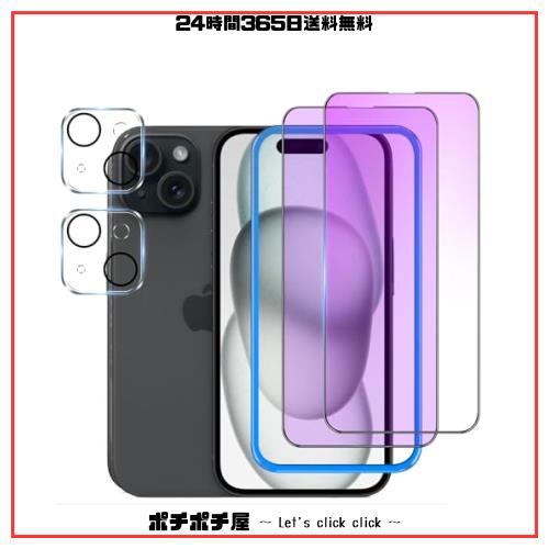 【ブルーライトカット 】 iPhone15 ガラスフィルム 【2枚】+ iPhone15 カメラフィルム 【2枚】【ガイド枠付き】 液晶保護 フィルム ブル