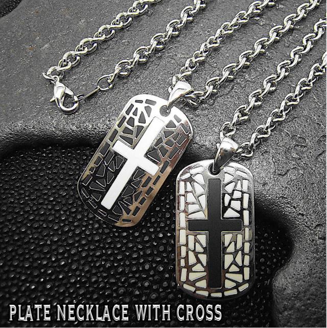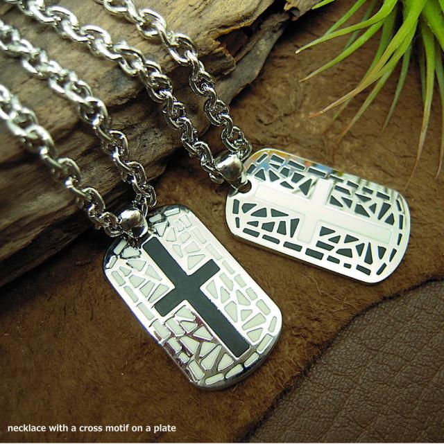 プレートにクロスモチーフのネックレスです。プレートにはステンドグラス風の模様が施され、十字架が際立って見えます。