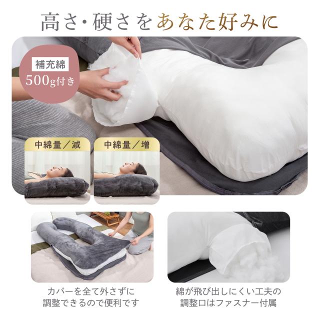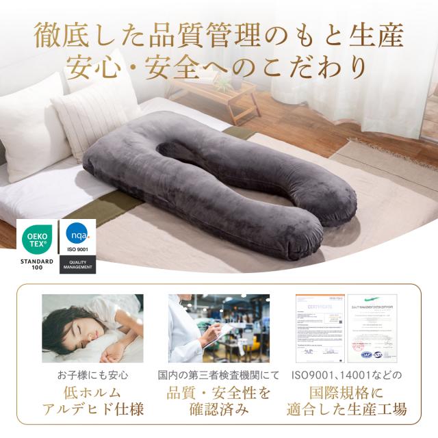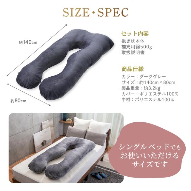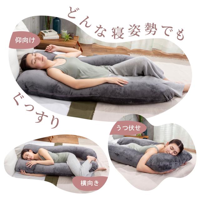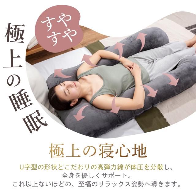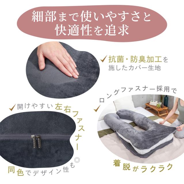 【性別・年齢問わず使える】独自な形状×高弾力のワタで体をしっかりサポート!女性や妊婦さんはもちろん、男性にもお使いいただけます。妊婦枕、授乳クッション、背もたれクッション、足枕などの多機能枕として使用することができます【体圧分散】独自の高弾力ワタと柔らかい高級ベロア生地カバーで全身体圧を適宜分散。身体全体を優しく包み込み快眠へ導き、どんな寝姿勢でも負担をかけずスムーズに寝返り可能です【理想の高さに調整】枕本体に3ヶ所の調整口が付いており、綿を出し入れ可能。補充用ワタ500gが付属しお好みに合わせて高さを自由に簡単に調節いただけます【いつでも清潔、抗菌防臭仕様洗えるカバー】高級光沢感がある柔らかいベロア生地カバーを採用。さらにカバー生地に抗菌・防臭加工を施すことで細菌の繁殖を抑え、気になるニオイを防ぎます[商品仕様]●サイズ : 140cm×80cm ●材質 : 中材/ポリエステル100% 、カバー生地/ポリエステル100% ●カラー : ダークグレー ●製品重量 : 約3.2kg ●箱サイズ : 43×33×17cm ●日本語取扱説明書 ●安心の1年間保証書 ●抗菌防臭仕様 ●製造国:日本企業開発/日本デザイン/中国専用工場生産
