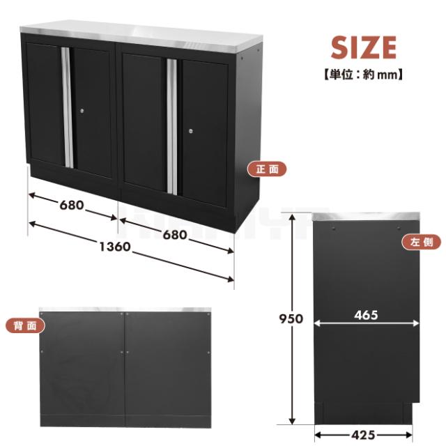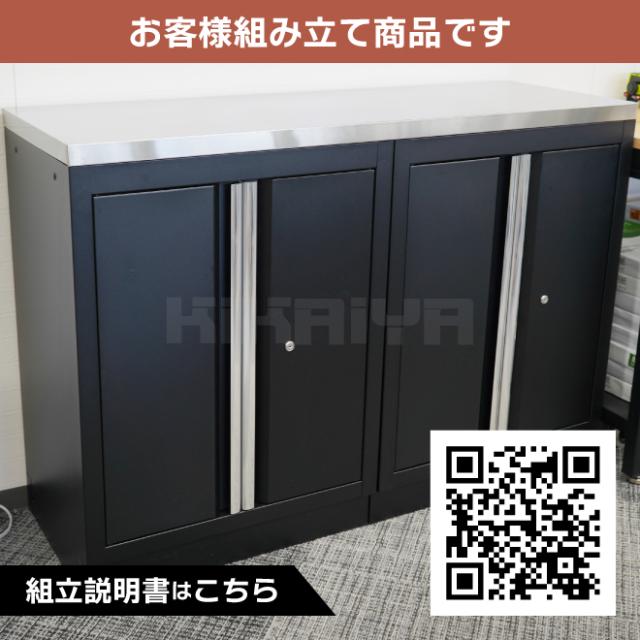 ガレージ キャビネット ステンレス天板 両開き扉 収納 作業台 ブラック スチール H950×W1360×D465mm KIKAIYA