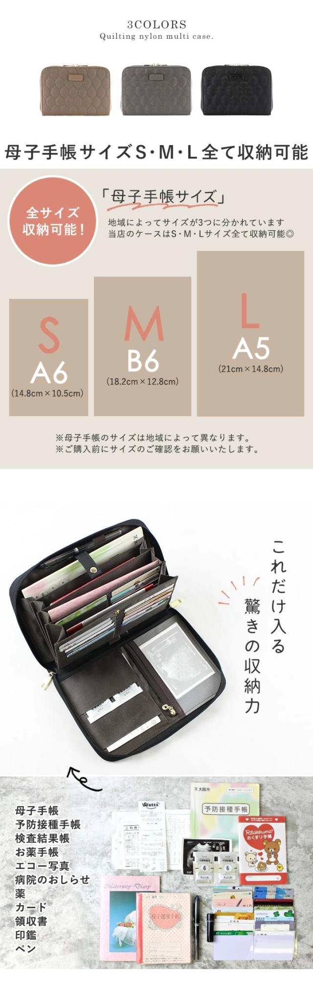 最大A5サイズが収まり、母子手帳サイズS、M、Lサイズ全て収納可能