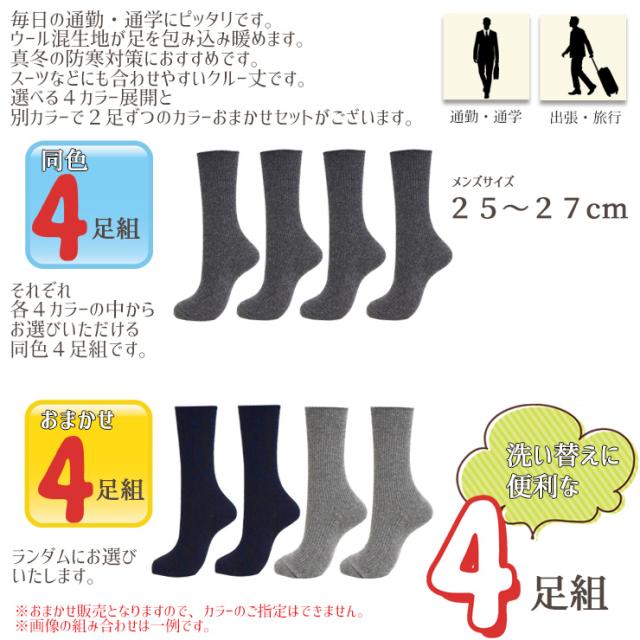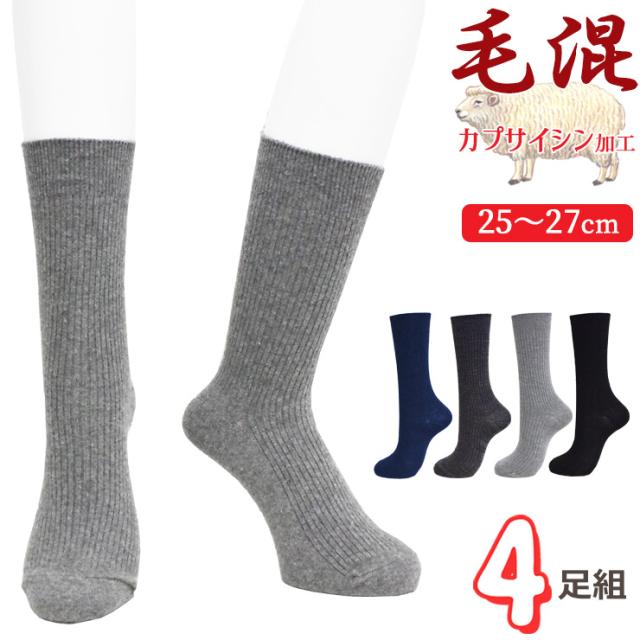 あったか靴下 メンズ 毛混 リブ編み クルーソックス 723204 4足組 送料無料 カプサイシン加工(05907)