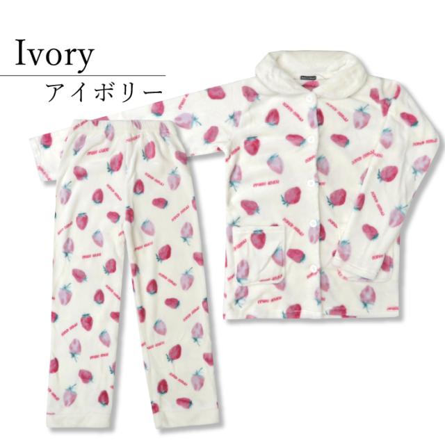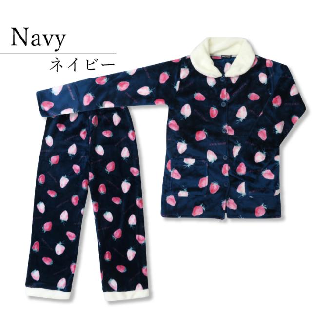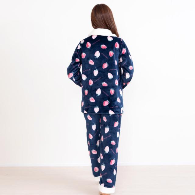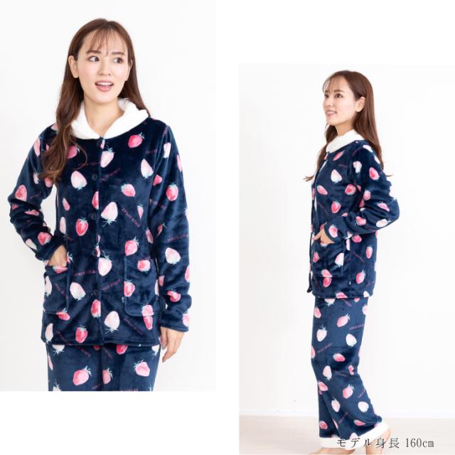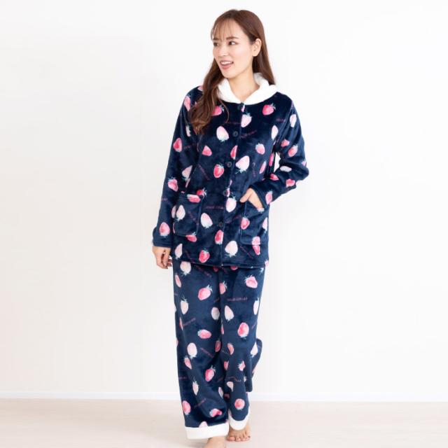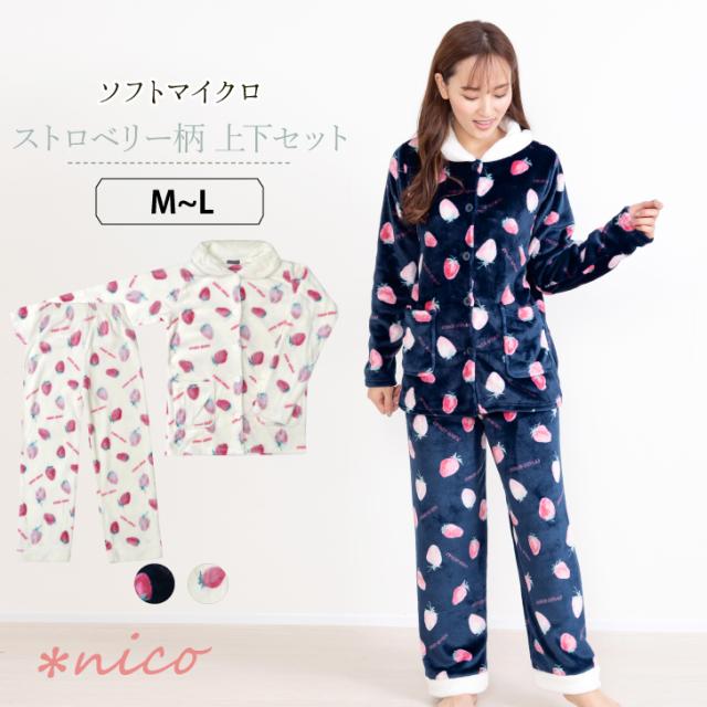 ソフトマイクロ 前開き ストロベリー柄 上下セット (97709)[メール便不可]【 イチゴ ルームウェア パジャマ レディース 女性 部屋着 秋物 冬物 秋冬物 長袖 セットアップ ボタン オールシーズン 寝巻 かわいい】