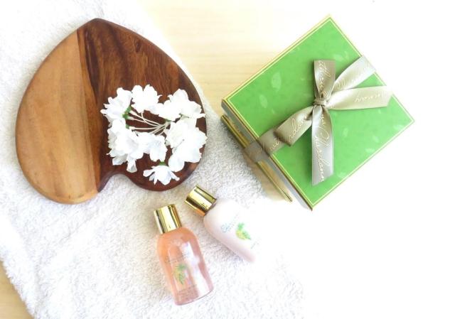 パッケージの中にはボディーウォッシュ100mL、ハンド&ボディーミルク100mL、バススポンジ 各1個が入っています。