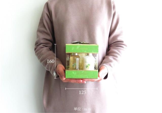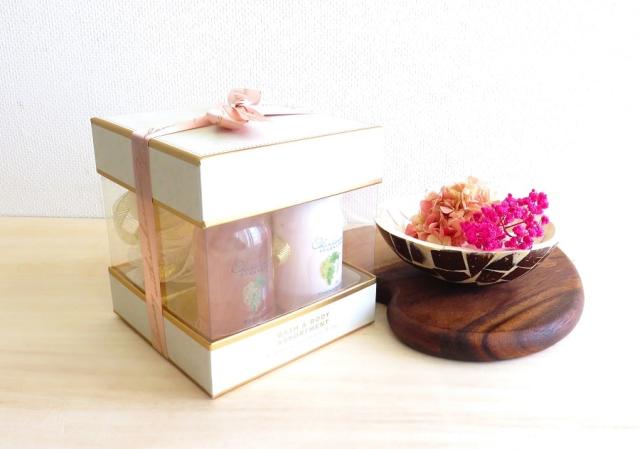 果汁味あふれるみずみずしいアロマが香り立つ、ボディーウォッシュとハンド&ボディーミルクのギフトセット。華やかで贅沢な雰囲気を放つ特徴的な大きなリボン、そのまま贈り物として渡すことも出来るパッケージが魅力的。