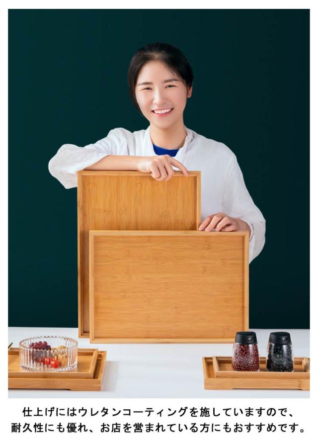 | ナチュラル仕上げのスタイリッシュな長角膳です。 手になじむ天然木の温もり。気品あふれる木製のトレーです。 仕上げにはウレタンコーティングを施していますので、耐久性にも優れ、お店を営まれている方にもおすすめです。 飽きのこないシンプルなデザインで使いやすいです。 ご家庭では、気軽にオシャレなカフェの雰囲気を演出できます。 お盆にのせて食事をすると、お盆ごとさっと引けばすぐに片付けられるので後片付けも簡単です。 | |