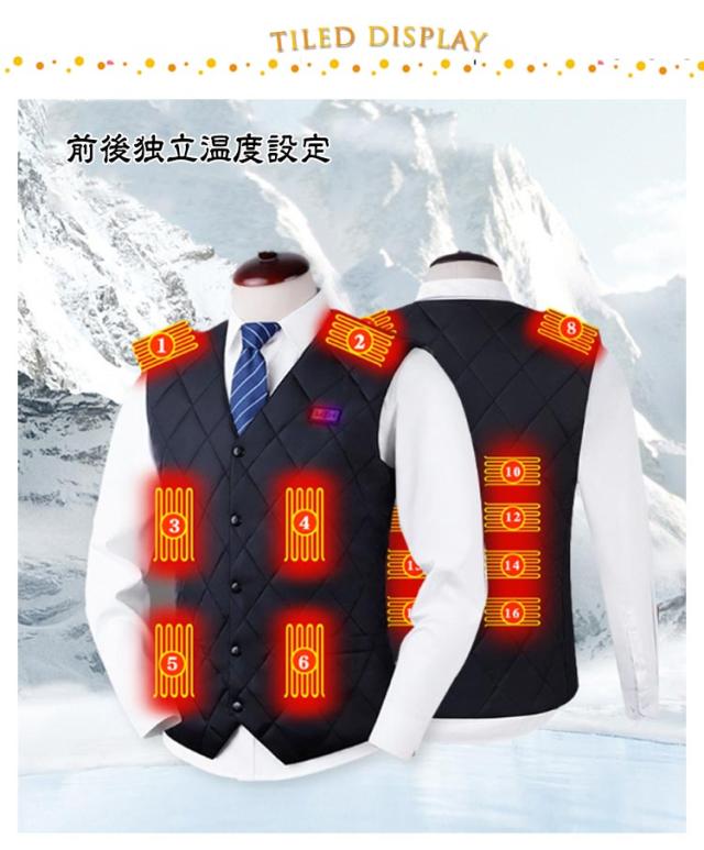 | 16箇所 電熱ベスト 寒さに敏感なところをしっかりと温めます 三段階温度調整可能 前後独立温度設定 手洗い&洗濯機OK | |