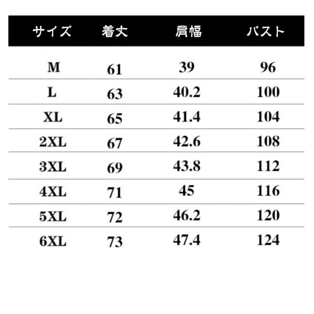 | サイズについての説明 | M L XL 2XL 3XL 4XL 5XL 6XL サイズ:写真通り ※上記サイズは平置き実寸になります。サイズ表の実寸法は商品によって1-3cm程度の誤差がある場合がございます。 |