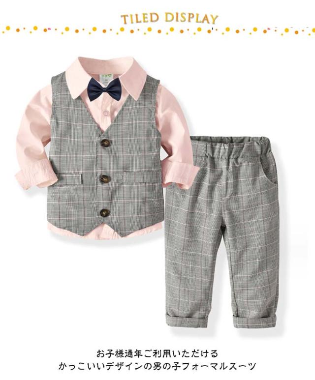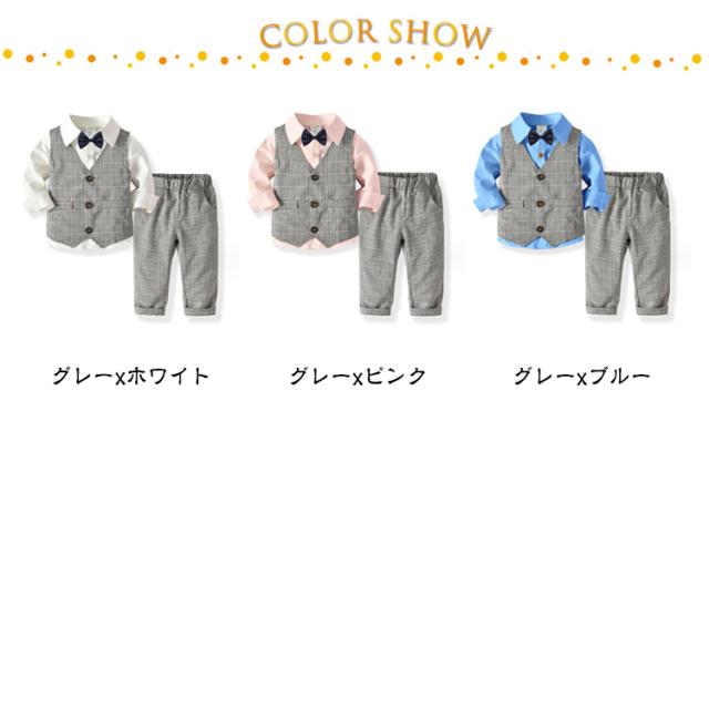 | 4点セット フォーマルスーツ 80-130cm お子様通年ご利用いただけるかっこいいデザインの男の子フォーマルスーツ ちょっとしたお出かけはもちろん、七五三や卒入学式、 冠婚葬祭などオールマイティーにご利用いただけます。 | |