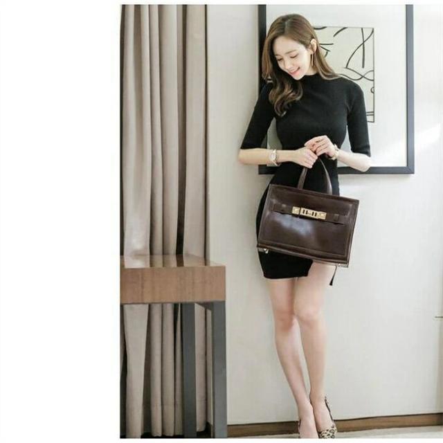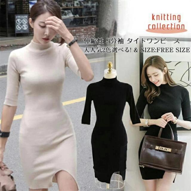 【即納】ワンピース ニットワンピース リブニットワンピ ストレッチ スリット入り 伸縮性 5分袖 タイトワンピース ミニ丈 オフィス シンプル OL