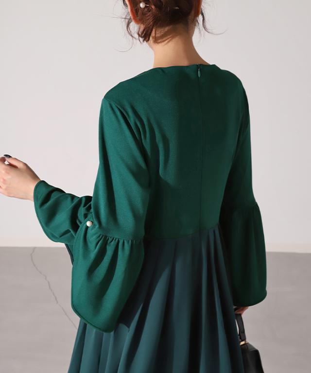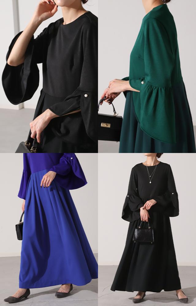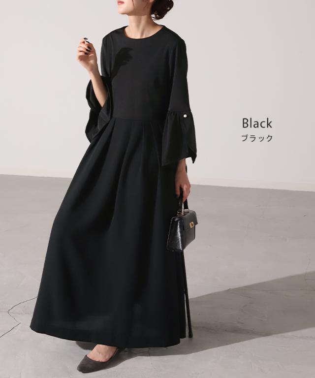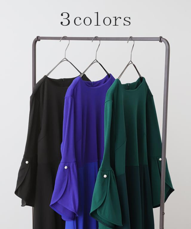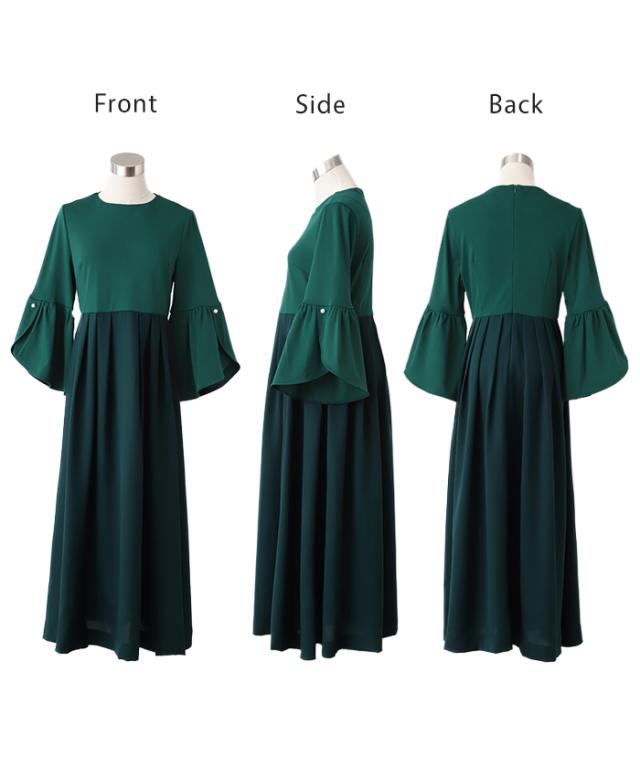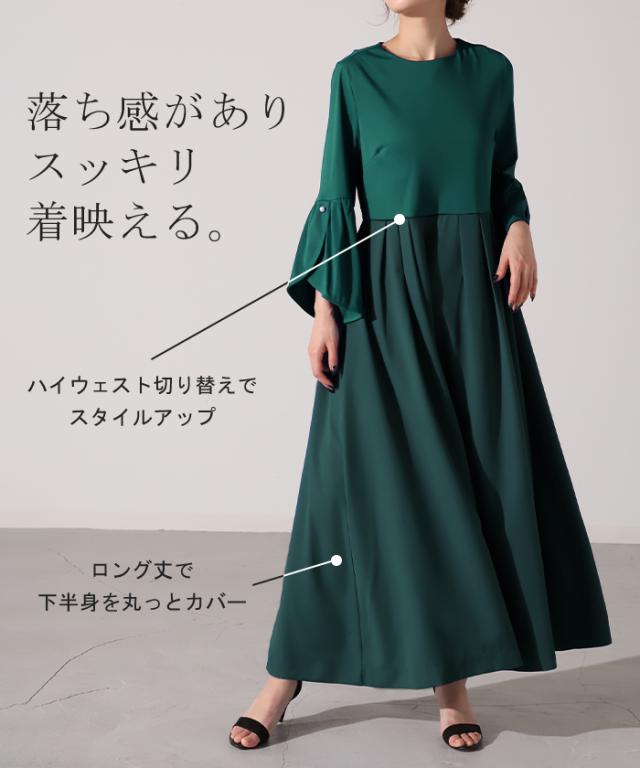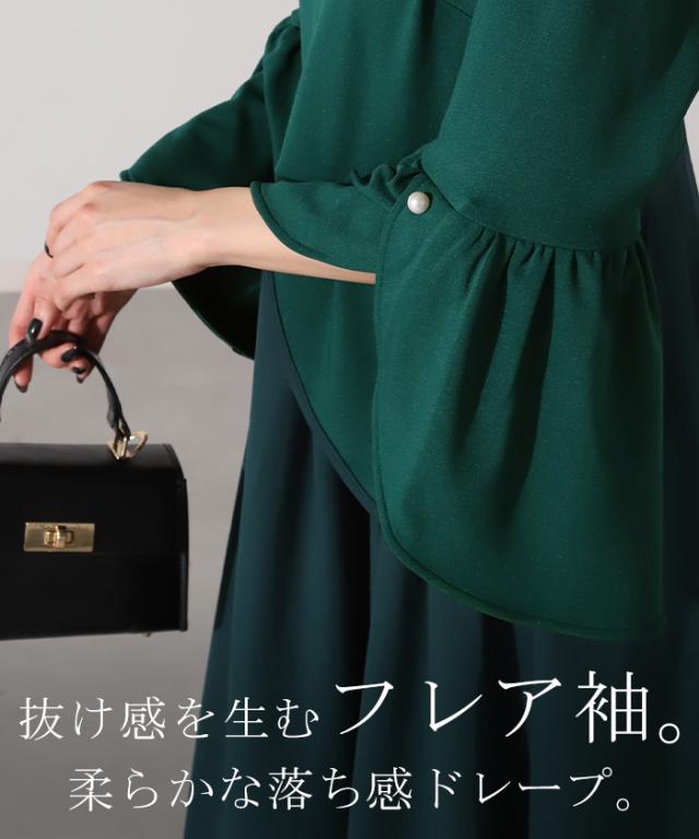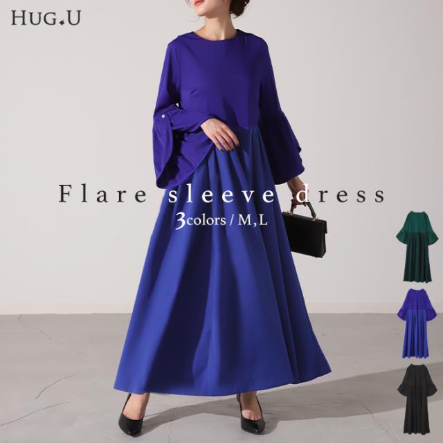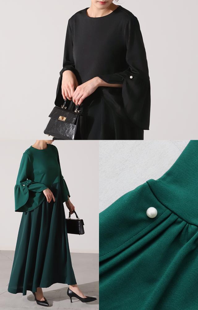 ワンピース パール ドレス フレア袖 袖あり 結婚式 オケージョン ロングワンピース ロング ワンピ レディース Aライン 長袖 パーティー きれいめ 無地 フォーマル パーティードレス 二次会 演奏会 伸縮 薄手 グリーン 黒 秋 冬 HUG.U 秋新作