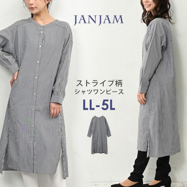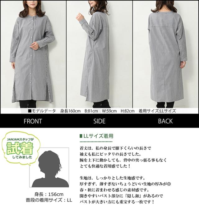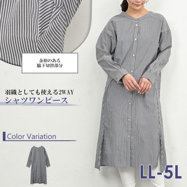 大きいサイズ レディース シャツワンピース 長袖 メール便対応 ロング丈 ストライプ柄 脇下くちばしカット LL/3L/4L/5L ゆったりサイズ ぽっちゃり女子 プラスサイズ