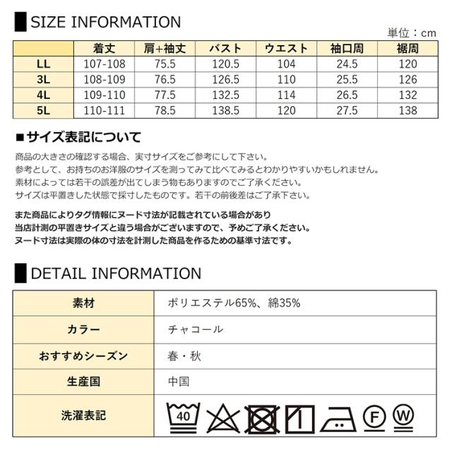 5L:着丈110-111 肩+袖丈78.5 バスト138.5 ウエスト120 袖口周27.5 裾周138