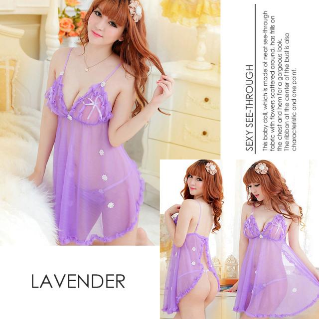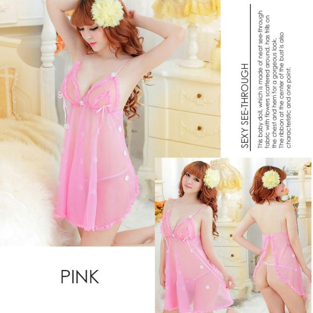 清楚なシースルー生地にお花が散りばめられ、胸元と裾にフリルを施し、ワンポイントにリボンを胸の中心部に♪