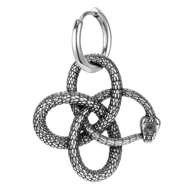 蛇が絡みつく紋章のようなチャームをシンプルなフープピアスにセットしたステンレス製リングピアス。