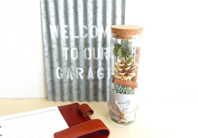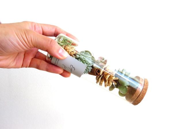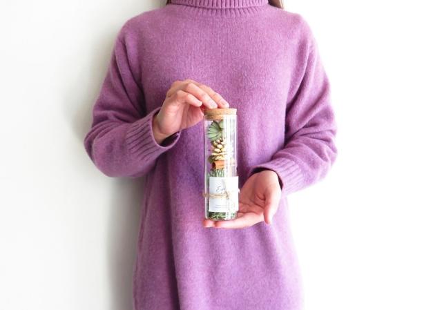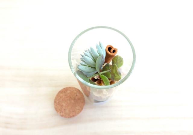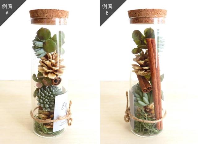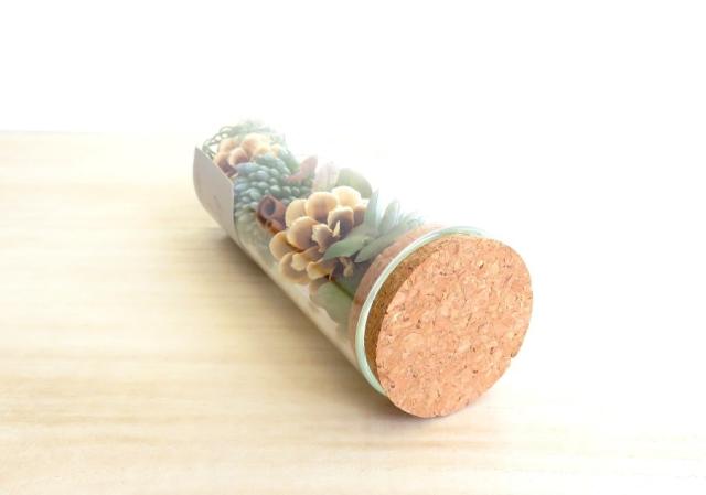 同シリーズの他種と異なり上部をコルク製のフタとしたデザイン。詰め込まれた各種植物たちも壊れにくくなって安心。 |