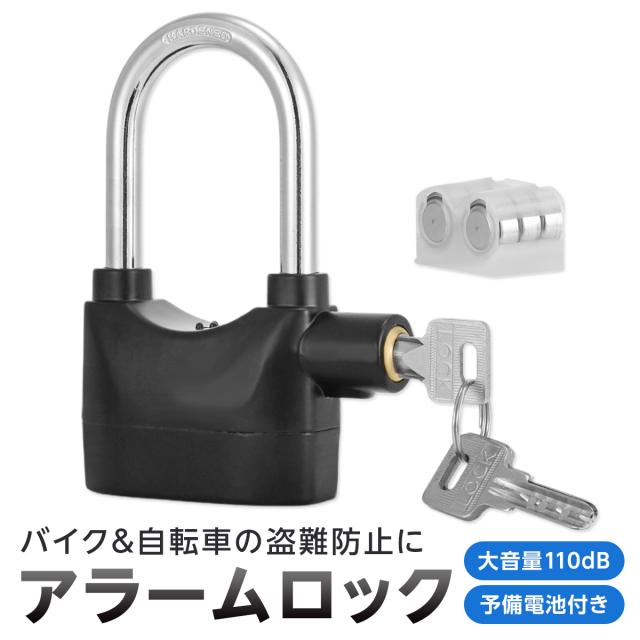 バイクや自転車の盗難防止に最適な南京錠型アラームロック。衝撃振動を感知すると110dBの大音量アラームで盗難撃退!太さφ10mmの極太バーで愛車をしっかりロック。バイクのディスクロック以外にも、いたずら防止や自転車やガレージの防犯対策等さまざまな用途に活躍します。ピッキングしにくい形状のカギ穴で高いセキュリティを発揮。簡単な操作でアラームのオン・オフができ、迷わず使用できる点も魅力です。スペアキー3本とスペアバッテリー1セットが付属しています。≪商品内容≫・アラームロック本体×1・スペアキー3本