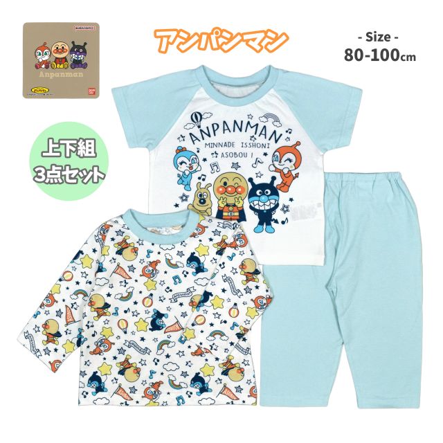 アンパンマン 綿100% 長袖 半袖 パンツ パジャマ 3点上下組 。